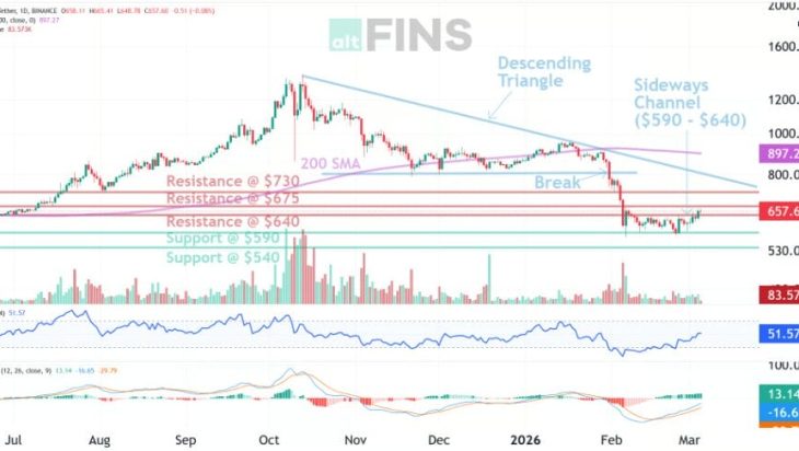 CoinCodex forecasts $609 by mid-March and up to $964 by end-2026. CoinLore targets $2,072 as the bullish year-end case. InvestingHaven models $728–$1,424. Coinpedia’s bull scenario reaches $2,000. The $1,000 level — a clean psychological and technical milestone — sits within reach if BNB clears the $700–$760 resistance zone Coinpedia has flagged as the key accumulation-to-expansion trigger. The RSI at 22 suggests the selling is close to exhausted.