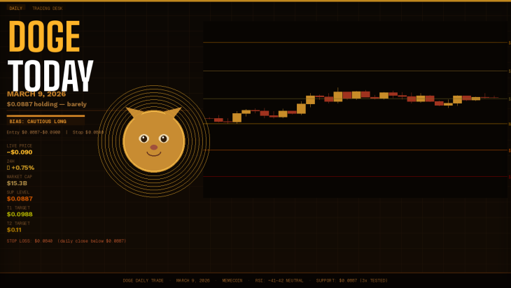 Tags: DOGE price prediction today, Dogecoin price March 9 2026, will DOGE bounce today, DOGE trade setup 2026, Dogecoin technical analysis March 2026, DOGE $0.09 support, Dogecoin below $0.10, DOGE ETF DOJE, DOGE descending wedge, Dogecoin breakout or breakdown, DOGE BTC correlation, Dogecoin 48 hour outlook, DOGE meme coin March 2026